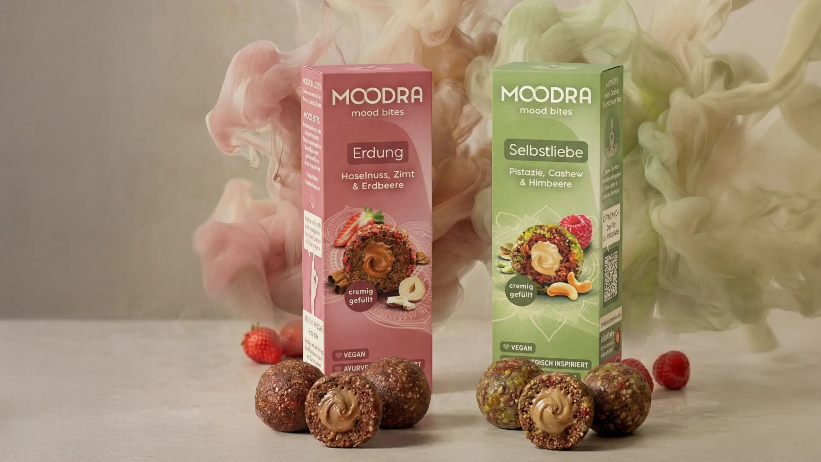 Sanfte Impulse auf der Verpackung – wie Affirmationen, Handgesten oder ein QR-Code zu vertiefenden Übungen – laden Dich ein, Deinen Snack-Moment achtsam zu genießen.