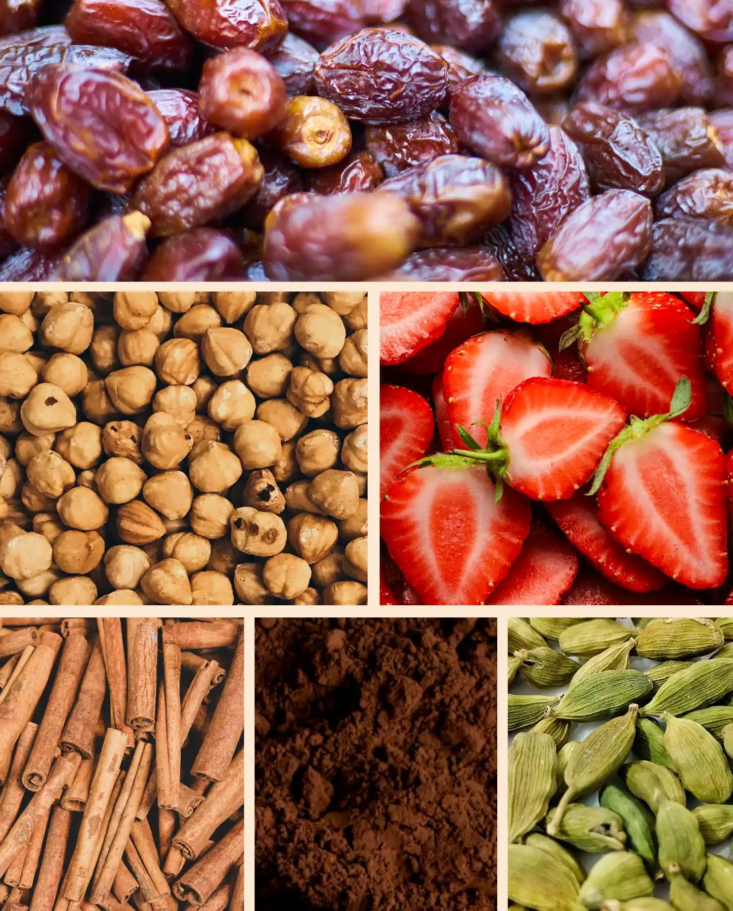 61% Dattel, 13% Haselnussmus, 12% Erdbeerfruchtpulver, Inulin, 3% Haselnuss, Kakaopulver, 0,3% Zimt, Kardamom, Salz.