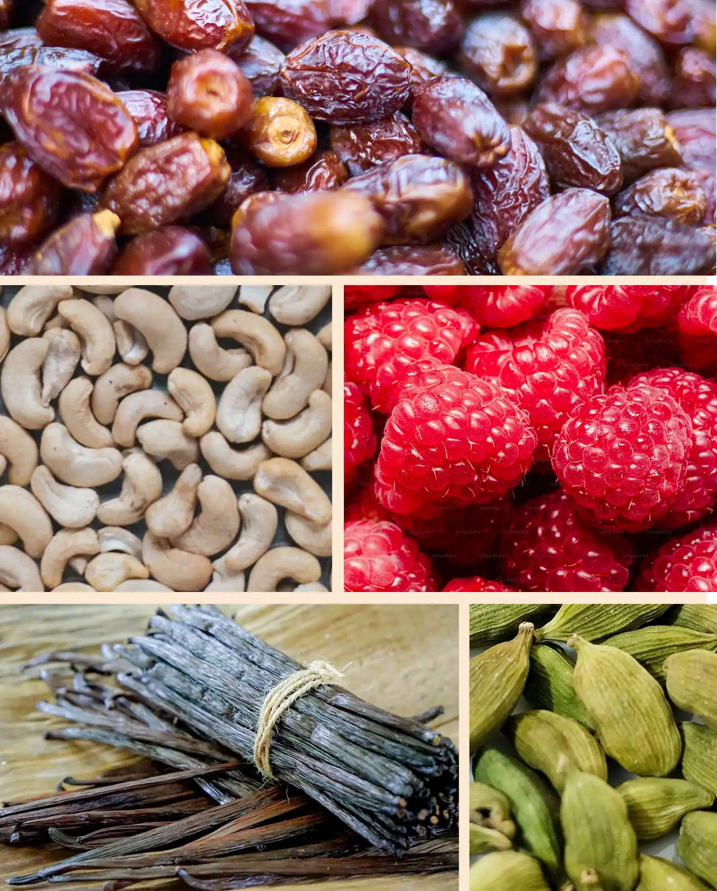 63% Dattel, 20% Cashewmus, 6% Pistazie, 4% Himbeerfruchtpulver, Inulin, Vanille, Kardamom, Salz.